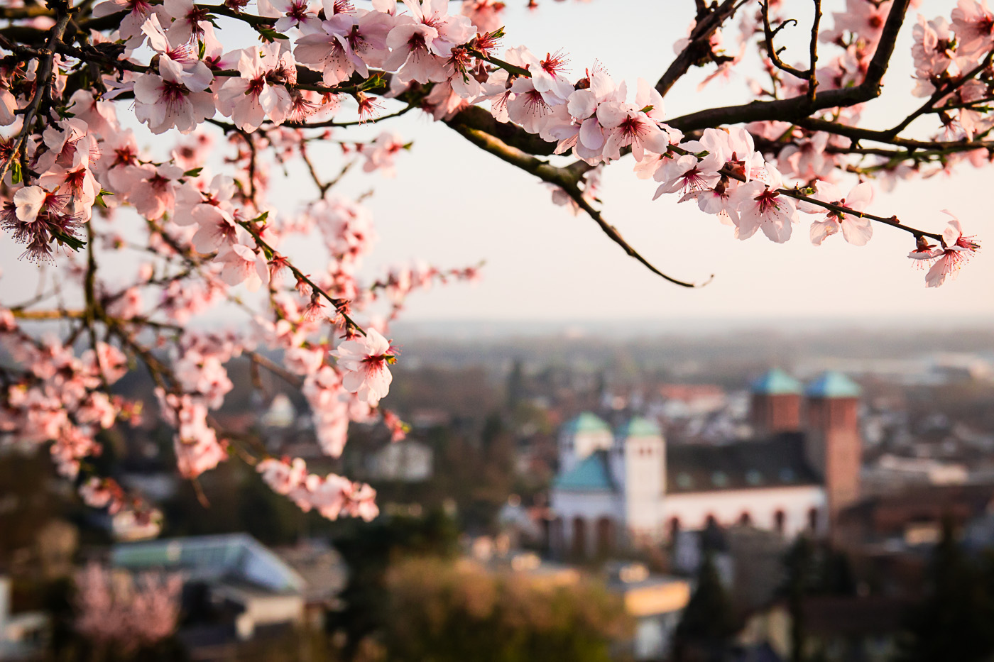 So früh wie in diesem Jahr hat es schon lange nicht mehr bei uns geblüht. Die Gäste unserer Ferienwohnung konnten nach wenigen Minuten zu Fuß die zartrosa Blüte im Weinberg bewundern. Auch, wer zu Fuß nach Bensheim spaziert ist, wurde nicht enttäuscht. Hier ein Bild mit Blick vom Kirchberg auf die Stadtkirche St. Georg. (Foto: Gerd Müller)